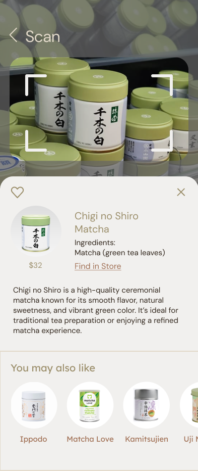 I designed a mobile app that enhances the in-store experience without disrupting Maruichi Select’s cozy atmosphere. The app focuses on three core features that address crowding, navigation, and cultural exploration.